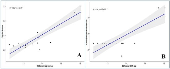 Analyses of variance (ANOVA) were performed to analyze the variation in nuclear DNA size (R 4.2.1 software- Stat package and agricolae). The significance level = 0.001 was used. Pearson correlation analysis was performed to learn the associations among nuclear DNA content, chromosome number and ploidy status using R 4.2.1 software (Package-ggpubr and ggplot2).