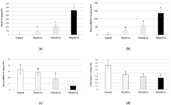 Intracellular Cu concentrations were lower and reached approximately 300 µg/g DW at 50 µM Cu concentration tested during 24 h, or even up to 1700 µg/g DW (Figure 1b) at the highest external Cu dose tested (500 µM). The increase in intercellular Cu content in T. barbieri was statistically significantly negatively correlated with a decrease in intracellular K content, from approximately 20 mg/g DW (control) to approximately 4 mg/g DW at 500 µM Cu treatment (Figure 1c).