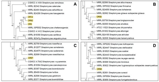 - Labeda, D.P.; Goodfellow, M.; Brown, R.; Ward, A.C.; Lanoot, B.; Vanncanneyt, M.; Swings, J.; Kim, S.B.; Liu, Z.; Chun, J.; et al. Phylogenetic Study of the Species within the Family Streptomycetaceae. Antonie Van Leeuwenhoek 2012, 101, 73–104. [Google Scholar] [CrossRef] [PubMed]