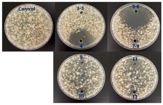 - Senthilkumar, M.; Amaresan, N.; Sankaranarayanan, A. Antagonistic Activity of Volatile Compound of bacteria against Phytopathogens: Dual Plate Assay. In Plant-Microbe Interactions. Springer Protocols Handbooks; Humana: New York, NY, USA, 2021; pp. 171–173. ISBN 978-1-0716-1079-4. [Google Scholar]