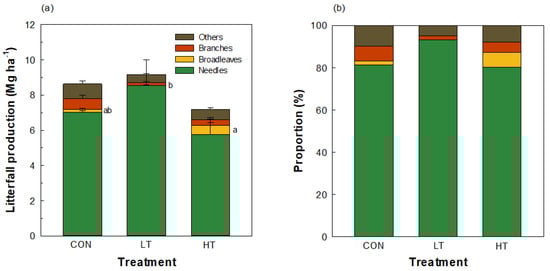 (a) Annual litterfall production and (b) proportions of each component in the Pinus koraiensis plantation 10 years after thinning (CON, control (no thinning); LT, light thinning (32% removed); HT, heavy thinning (64% removed)). Needles indicate leaf litterfall of P. koraiensis. Broadleaves include leaf litterfall of other species except P. koraiensis. Branches include twigs. Others indicate all tissues except leaves and branches. Vertical bars represent the standard error (n = 4). Means of broadleaves with different lowercase letters indicate significant differences between treatments (thinning intensities) in one-way analysis of variance (ANOVA) based on Tukey’s studentized range (HSD) test. Means without lowercase letters were not significantly different.