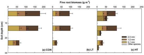 Vertical distribution of fine root biomass in the Pinus koraiensis plantation 10 years after thinning ((a) CON, control (no thinning); (b) LT, light thinning (32% removed); (c) HT, heavy thinning (64% removed)). Other species indicates fine roots of understory vegetation except P. koraiensis. Fine roots of other species were not observed in the control and light thinning stand. Vertical bars show standard errors (n = 8).