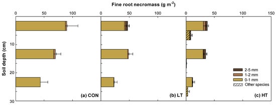 A similar pattern was observed for fine root necromass (Figure 3, Table S2). Total root necromass (0–5 mm) was highest in the CON treatment (202.84 g m−2), followed by LT (118.49 g m−2) and HT (96.78 g m−2) treatments. The fine root necromass of other species was solely detected in the HT stand, representing approximately 13% of the total root necromass.