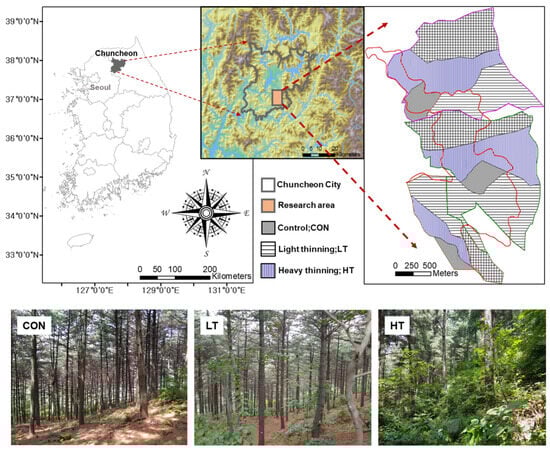 This study was conducted in the Pinus koraiensis plantation at Mt. Gari, Chuncheon-si, Gangwon-do of South Korea (37°53′ N, 127°52′ E) with a mean elevation of approximately 367 m above sea level and a mean slope of 25° (Figure 4). The area of the plantation was 117 ha, where P. koraiensis seedlings (Korean pine) were planted in the 1960s (c.a., 60 years old already in 2023).
