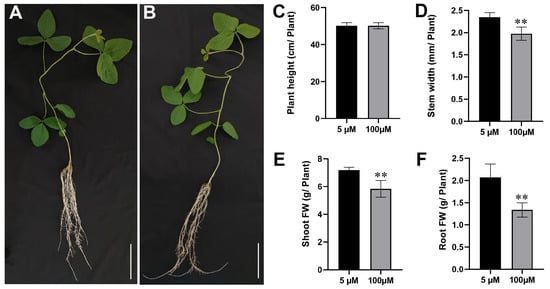 Effects of soybean growth with Mn treatment. Morphologies of soybean plants at various concentrations of Mn: (A) 5 μM; (B) 100 μM (bars = 5 cm). (C) Soybean plant height; (D) soybean plant stem width; (E) fresh weight of shoot; (F) fresh weight of root (** p ≤ 0.01).