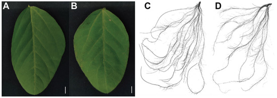 Phenotypes of soybean leaves and roots at different Mn concentrations: (A) leaf phenotypes (5 μM); (B) leaf phenotypes (100 μM); (C) root phenotypes (5 μM); (D) root phenotypes (100 μM). Bars = 2 cm.