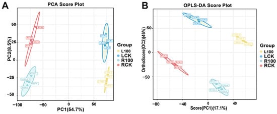 The statistical analysis of soybean leaves and roots metabolome data at different Mn treatment concentrations. (A) PCA; (B) OPLS-DA. LCK, L100, RCK, and R100 represent 5 µM Mn leaves, 100 µM Mn leaves, 5 µM Mn roots, and 100 µM Mn roots, respectively.