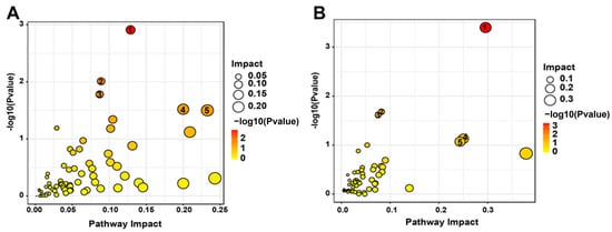Bubble diagrams of metabolism pathways of DMs in soybean leaves and roots. (A) L100 vs. LCK; (B) R100 vs. RCK. Each bubble represents a kind of metabolism pathway. The darker and larger the bubble is, the stronger the association between the metabolic pathway and Mn stress is. Larger size and darker color of the bubbles represent a stronger correlation between the metabolism pathway and Mn poisoning.
