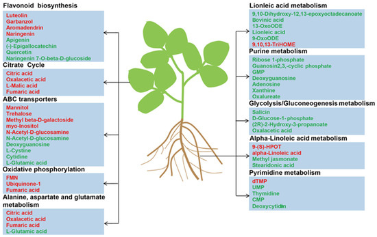 The major metabolites in soybean leaves and roots responding to Mn poisoning. The red represents the increased metabolites, whereas the green represents the decreased metabolites.