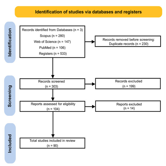 After initial analysis, 429 papers were removed. Of these, 230 were duplicates, and 199 were not in accordance with the inclusion and exclusion criteria pre-established in the protocol (Table S1). The remaining 104 articles were submitted for full reading and evaluated for eligibility. At the end of the analysis, 90 papers were accepted for being in accordance with all the established criteria (Figure 1). All articles accepted for review are organized in Table S2.