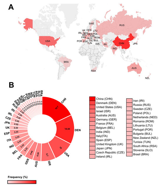 Percentage of total articles collected by country. (A) A physical map showing the countries that contributed to the studies selected in this systematic review. (B) Percentage of articles originating in each country.