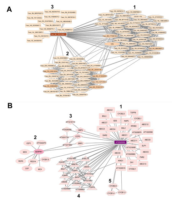 Analysis of the systems biology of plant serpins. (A) The network built with the serpins of monocots, presenting the functions of cell regulation (1); catabolic processes, proteolysis involved in cellular protein catabolic processes, and collagen catabolic processes (2); and pollen development (3). (B) The network built with eudicot serpins with functions of mitotic-cell-cycle phase transition and regulation of cell cycle (1); cysteine-type peptidase activity (2); serine-type endopeptidase inhibition activity (3); protein dephosphorylation (4); and mitotic-cell-cycle phase transition. The network was constructed using the serpins present in Table 2. The construction of the monocot network used T. aestivum, and the eudicot network used the model organism A. thaliana as a basis for the development of the network. The width of the edges of the geometric figures that contain the proteins in the networks represent the degree values (network A ≥ 1 and ≤61, network B ≥ 1 and ≤55), with the wider edges being related to the proteins with the highest value of degree, and the narrower edges refer to proteins with a lower degree value. The colors are related to the betweenness values (network A ≥ 0 and ≤1627, network B ≥ 0 and ≤1927), proteins with darker colors represent higher betweenness values and proteins with lower betweenness values are represented in lighter colors (Spreadsheets S1).