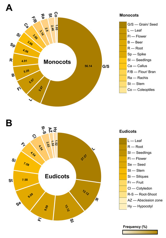 Distribution of serpins in different plant parts. Serpins are located at the protein and/or transcript level in different angiosperm plant species. (A,B) the frequency of distribution in percentage of monocots and dicots in different tissues and in products derived from wheat and barley grains.