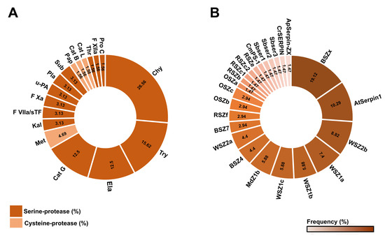 The proteases that have been submitted to the highest number of inhibitory assays with different serpins are, in order, chymotrypsin, trypsin, elastase, and cathepsin G, totaling 67.18% (Figure 5A).