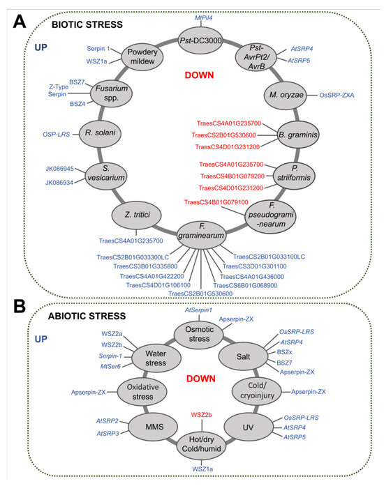 With regard to abiotic stresses, serpins are upregulated mainly due to saline stress and water deficit, as well as by UV, methanesulfonate (MMS), osmotic and oxidative stress, temperature and humidity variations, and cryoinjury (Figure 6B).