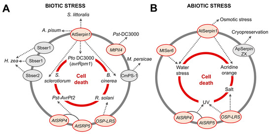 Action of serpins under different stresses. (A,B) shows the relationship of serpins in the plants’ defense systems when subjected to different biotic and abiotic stresses. Serpins in red circles are over- or under-expressed proteins that are related to cell death caused by pathogens and different abiotic stress conditions (central red circle). In gray circles are proteins that were not related to cell death, but that affected insect development (biotic stress) or had a positive effect on the survival of cryopreserved callus (abiotic stress).