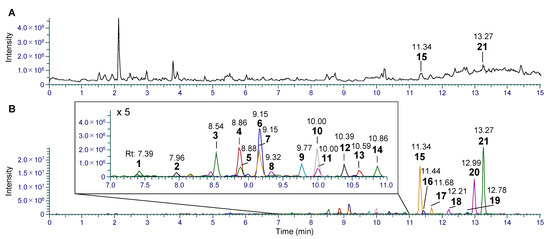 (A) Total ion chromatogram in the positive ion mode and (B) extracted ion chromatogram from the crude diterpenoid fraction of the stems of W. indica.