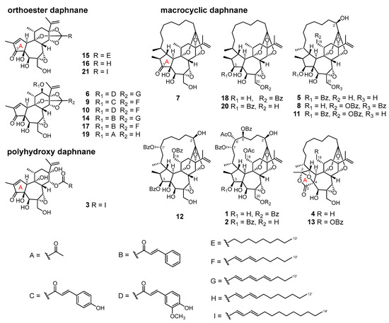 The isolated compounds were identified by detailed NMR and MS spectroscopic analyses. In the 1H- and 13C-NMR spectra, the characteristic resonances for an isopropenyl moiety at δH 4.83–4.99 (Ha-16), 4.94–5.17 (Hb-16), and 1.72–1.84 (H3-17), an epoxy group at δH 3.32–3.57 (H-7), δC 60.0–61.0 (C-6), and 63.5–64.4 (C-7), and an orthoester group at 116.5–119.8 (C-1′), indicated that they were daphnane diterpenoids (Tables S1 and S2) [10].