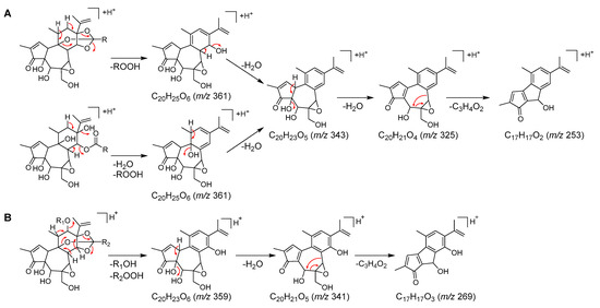 Proposed ESI-MS/MS fragmentation pathways for minor daphnane diterpenoids in positive mode. (A) peaks 3 and 16, and (B) peaks 6, 9, 10, 14, and 19.