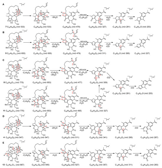 Proposed ESI-MS/MS fragmentation pathways for minor daphnane diterpenoids in positive mode. (A) peak 7, (B) peak 5, (C) peaks 8, 11, (D) peak 4, and (E) peak 13.