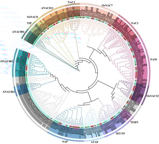 The NAC gene family is one of the largest plant-specific transcription factor families, playing a crucial role in regulating growth and development as well as responses to diverse biotic and abiotic stresses in plants [1,2]. The NAC family is named according to three conserved domains, including petunia no apical meristem (NAM), ATAF1/2 and cup-shaped cotyledon (CUC) [3,4]. The NAM gene was firstly cloned and functionally characterized in petunias, which was found to determine the position of the shoot apical meristem and primordia or in plants [5]. Subsequently, the ATAF1/2 and CUC genes were successively found and identified [6]. Generally, NAC proteins have a typical and conserved N-terminal region (NAC domain), together with a variable C terminal [7]. The NAC domain is about 150 AA in length, comprising five subdomains (A–E), of which subdomains A, C and D are rather conserved, while subdomains B and E are highly viable with special functions [1,8,9,10]. At the same time, the C-terminal region is mainly involved in transcriptional activation or repression to achieve its regulation function (TAR or TRR) [11,12].