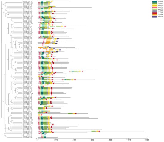 Based on the multi-sequence alignment, the conserved region in these 110 DoNAC proteins was further identified (Figure 2). Results showed that the N-terminus seemed rather conservative among them, while the C-terminus was highly variable, which was consistent with previous studies. A total of five conserved regions were found, four of which were located at the N-terminus, and the remaining one was adjacent to the C-terminus. It was found that protein conservation gradually becomes lower from N to C terminus. Furthermore, the conserved functional domain among them were analyzed using the MEME tool to obtain clues about the function that they might be involved in. In total, nine highly conserved functional domains were found and all of them were found adjacent to the N-terminus, with none in found in the C-terminus (Figure 3). Most of the DoNACs possessed Motif 1 to 8, suggesting they are highly conserved in the functional domain composition. It is no accident that all of the DoNAC proteins contained the NAM, ATAF and CUC domains.