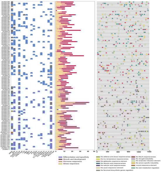 The 1.5 kb genomic sequences upstream from the transcription start sites (TSS) of these DoNACs were extracted to predict the cis-acting elements. Totally, 1890 cis-elements were found in them with an average of 17.2 elements per DoNAC gene, which are widely associated with growth and development (1004), differentiation and specificity (33) as well as hormone responsiveness (299) and stress responsiveness (562) (Figure 4 and Table S1). A large number of cis-elements associated with growth and development were found in the DoNACs, such as CAT-box (related to meristem expression), circadian (related to circadian control), GCN4_motif (related to endosperm expression) and MSA-like (related to cell cycle regulation). Almost each of the DoNACs contained the cis-element are involved in light responsiveness, including G-box, Sp1, TCCC-motif and ATCT-motif. HD-Zip I elements that are involved in the differentiation of the palisade mesophyll cells, were found in nine DoNACs, and an RY-element that is involved in seed-specific regulation was also found in nine DoNACs, suggesting that DoNACs have a function in tissue differentiation and specificity. Particularly, the promoter region of DoNAC66 possessed three RY-elements, indicating it might play an important role in flower or seed morphogenesis. Furthermore, the cis-elements related to diverse hormones were also widely identified in 93 DoNACs, including abscisic acid (ABRE), auxin (AuxRR-core and TGA-box) and gibberellin (P-box and TATC-box), of which DoNAC31 contained 11 ABRE elements, DoNAC3 contained two TATC-box and DoNAC101 had two TGA-box. Finally, 105 DoNACs (95.5%) were found to have 562 stress-responsive cis-elements, indicating their indispensable role in stress response in D. officinale. In detail, 46 DoNACs had MBS elements (involved in drought-inducibility) and 36 DoNACs had LTR elements (involved in low-temperature responsiveness). Among them, DoNAC90 had three LTR elements and DoNAC56 and DoNAC76 had two LTR elements, suggesting they might be involved in cold stress response.