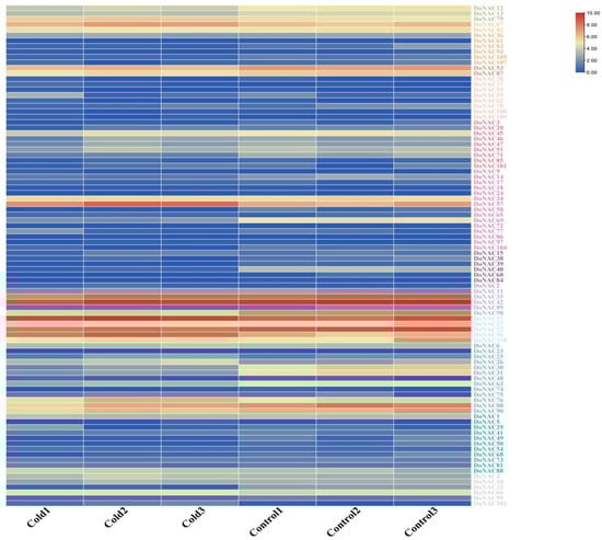 To identify the candidate DoNACs involved in response to cold stress, we further investigated their expression patterns under cold treatment (Figure 6 and Table S3). The results showed that a total of 87 out of 110 DoNACs showed expression under cold treatment, proving the crucial role of NAC in cold response. Compared to the control, most of the DoNACs showed lower expression levels under cold stress and the differentially expressed DoNACs between them were detected. In total, 31 DoNACs were found to be differentially expressed between the cold and control treatments, which could be considered cold-responsive DoNACs. Among them, 11 were up-regulated and 20 were down-regulated, respectively. The expression level of DoNAC102 showed 9.8-fold higher under cold stress than that of control, which is the most significantly up-regulated expression gene, followed by DoNAC56, DoNAC57 and DoNAC26. While DoNAC58 and DoNAC39 were the most significantly down-regulated expression genes, which displayed 42 and 37 times lower expression under cold stress compared to CK. These cold-responsive DoNACs could be used as important candidates for revealing their regulatory function in the cold stress response and tolerance in D. officinale.