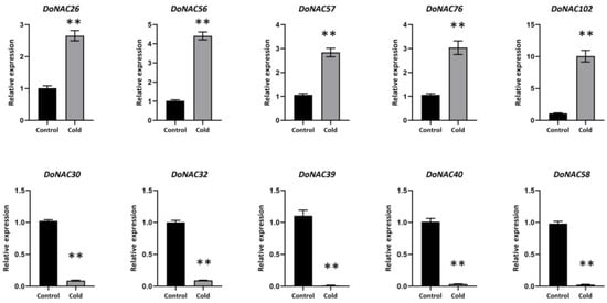 The expression levels of 10 randomly selected cold-responsive DoNACs under control and cold stress by qRT-PCR methods. ** represents significant level at 0.01.