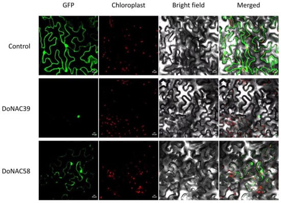Furthermore, the subcellular localization of two down-regulated candidates (DoNAC39 and DoNAC58) was investigated. OsNAC-GFP fusion protein transient vectors were constructed and then injected into tobacco leaf cells (Figure 8). The results showed that both of them were localized in the nucleus, demonstrating their role as transcription factors to regulate downstream biological processes.