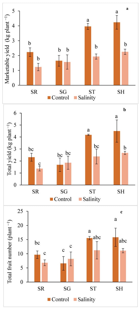 As shown in Figure 1a, the highest total marketable yield was observed in the control × SH and control × ST combinations (4.24 and 3.96 kg plant−1, respectively); thus it was much higher compared to the SR plants in the non-stress conditions. A slight decrease in the total yield per plant (Figure 1b) was observed in the SR in response to the salinity treatment; however, grafting onto SH significantly increased the total yield by 20% compared to the 80 mM NaCl stressed SR plants. In the non-stress conditions, the total fruit number per plant (Figure 1c) considerably increased by grafting the plants onto SH and ST. On the other hand, in the salt-stress conditions, this increase was not statistically significant. Moreover, the salinity significantly (by 12%) decreased the average fruit weight compared to the control plants. However, grafting onto ST and SH significantly enhanced the average fruit weight in saline conditions (by 21% and 26%, respectively), in comparison with the non-grafted plants (Figure 1d).
