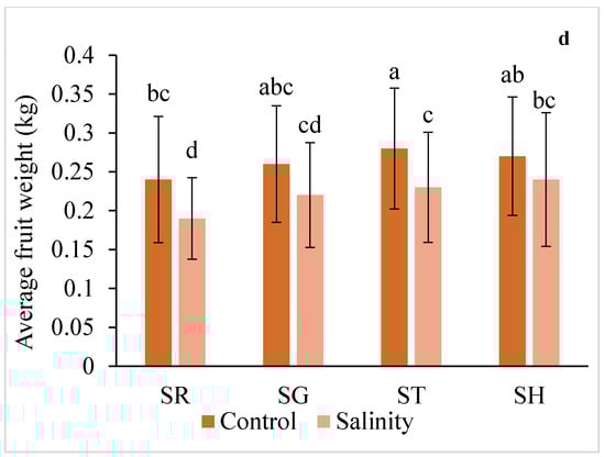 Interaction effect of salinity and use of different rootstocks on total marketable yield (a), total yield (b), fruit number (c), fruit average weight (d) of eggplant. Mean values (standard deviation) marked with different letters are significantly different according to Tukey’s multiple range test at p < 0.05. SR = self-rooted; SG = self-grafted; ST = Solanum torvum, SH = Solanum grandifolium × Solanum melongena rootstock.