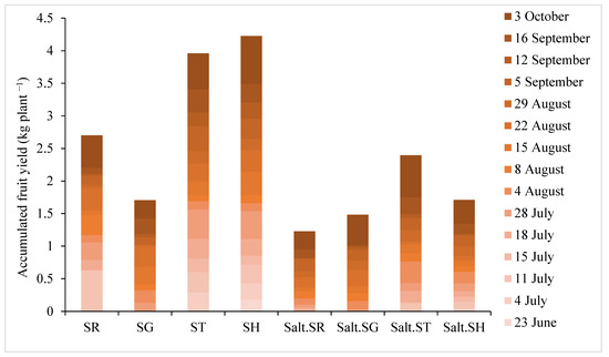 Effect of salinity and use of different rootstocks on accumulated fruit yield per plant during the 15 harvesting times of eggplant. SR = self-rooted; SG = self-grafted; ST = S. torvum rootstock, SH = S. grandifolium × S. melongena rootstock.