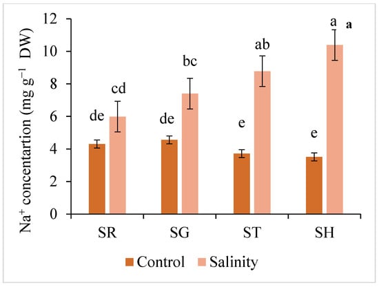 The plants grafted onto the ST or SH rootstocks had a higher Na+ concentration in the roots but less in the leaves and fruits than the SR or SG individuals (Figure 3). However, no significant differences were found between SH and ST in the Na+ accumulation. The plants grafted onto ST and SH accumulated 14% and 17% more Na+ in their roots, respectively, than the SR plants grown in the saline conditions. The highest Na+ concentration both in the leaf and fruit was determined in SG plants (Figure 3).