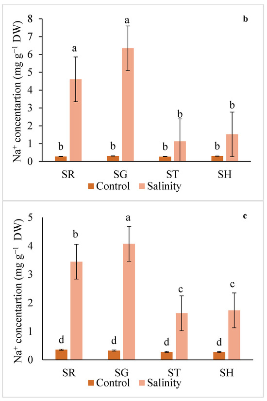 Interaction effect of salinity and use of different rootstocks on Na+ concentration in root (a), leaf (b), and fruit (c) of eggplants. Mean values (standard deviation) marked with different letters are significantly different according to Tukey’s multiple range test at p < 0.05. SR = self-rooted; SG = self-grafted; ST = Solanum torvum; SH = Solanum grandifolium × Solanum melongena rootstock.