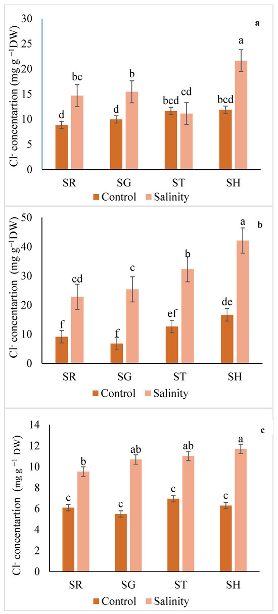 Interaction effect of salinity and use of different rootstocks on Cl− concentration in root (a), leaf (b), and fruit (c) of eggplants. Mean values (standard deviation) marked with different letters are significantly different according to Tukey’s multiple range test at p < 0.05. SR = self-rooted; SG = self-grafted; ST = Solanum torvum; SH = Solanum grandifolium × Solanum melongena rootstock.