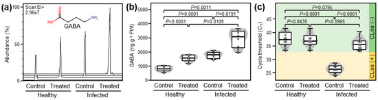 Effect of γ-aminobutyric acid (GABA) supplementation on the endogenous GABA levels and the bacterial titer in the leaves of healthy and ‘Ca. L. asiaticus’-infected Valencia sweet orange (C. sinensis) after derivatization with MCF using targeted GC-MS-SIM. (a) Representative chromatograms of GABA from healthy and Ca. L. asiaticus’-infected (infected) leaves without GABA treatment (Control) or after the treatment with 10 mM GABA (treated). (b) Endogenous GABA content (ng g−1 FW) from healthy and Ca. L. asiaticus’-infected (infected) leaves without GABA treatment (Control) or after the treatment with 10 mM GABA (treated). (c) Cycle threshold (CT) of reverse transcription quantitative PCR (RT-qPCR) for the detection of ‘Ca. L. asiaticus’ in HLB-symptomatic detached leaves of Valencia sweet orange after the treatment with 10 mM GABA (treated). The minimum and the maximum values are presented by whiskers, while thick horizontal lines specify the median. Boxes show the interquartile ranges (25th to 75th percentile of the data), white dots represent the raw data (n = 6), and gray shading represents the corresponding violin plot. Presented p-values are based on a two-tailed t-test to statistically compare each pair of treatments. Statistical significance was established as p < 0.05.