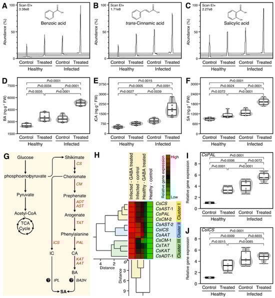 Effect of γ-aminobutyric acid (GABA) supplementation on the endogenous salicylates level and their biosynthesis genes in the leaves of healthy and ‘Ca. L. asiaticus’-infected Valencia sweet orange (C. sinensis). (A–C) Representative chromatograms of benzoic acid (BA), trans-cinnamic acid (tCA), and salicylic acid (SA), respectively, from healthy and Ca. L. asiaticus’-infected (infected) leaves without GABA treatment (Control) or after the treatment with 10 mM GABA (treated). (D–F) Endogenous contents (ng g−1 FW) of BA, tCA, and SA, respectively, from healthy and Ca. L. asiaticus’-infected (infected) leaves without GABA treatment (Control) or after the treatment with 10 mM GABA (treated). (G) Schematic representation of the SA biosynthesis pathway. (H) Relative gene expression of SA biosynthesis genes in healthy and Ca. L. asiaticus’-infected (infected) leaves without GABA treatment (Control) or after the treatment with 10 mM GABA (GABA treated). The transcript levels were organized using two-way hierarchical cluster analysis (HCA) using standardized gene expression patterns using Ward’s minimum variance method and presented as a heat map. Rows represent the SA biosynthetic genes, while columns represent different treatments. Low and high expression levels are indicated with green and red colors, respectively (see the scale at the top right corner). The full list of expressed genes, names, accession numbers, and primers is available in Supplemental Table S1. (I,J) Relative gene expression of phenylalanine ammonia-lyase (CsPAL) and isochorismate synthase (CsICS), respectively. The minimum and the maximum values are presented by whiskers, while thick horizontal lines specify the median. Boxes show the interquartile ranges (25th to 75th percentile of the data), white dots represent the raw data (n = 6), and gray shading represents the corresponding violin plot. Presented p-values are based on a two-tailed t-test to statistically compare each pair of treatments. Statistical significance was established as p < 0.05.
