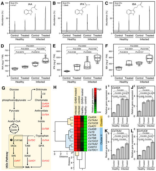 Effect of γ-aminobutyric acid (GABA) supplementation on the endogenous auxin contents and their biosynthesis genes in the leaves of healthy and ‘Ca. L. asiaticus’-infected Valencia sweet orange (C. sinensis). (A–C) Representative chromatograms of indole-3-acetic acid (IAA), indole-3-propionic acid (IPA), and indole-3-butyric acid (IBA), respectively, from healthy and Ca. L. asiaticus’-infected (infected) leaves without GABA treatment (Control) or after the treatment with 10 mM GABA (treated). (D–F) Endogenous contents (ng g−1 FW) of IAA, IPA, and IBA, respectively, from healthy and Ca. L. asiaticus’-infected (infected) leaves without GABA treatment (Control) or after the treatment with 10 mM GABA (treated). The minimum and the maximum values are presented by whiskers, while thick horizontal lines specify the median. Boxes show the interquartile ranges (25th to 75th percentile of the data), white dots represent the raw data (n = 6), and the gray shading represents the corresponding violin plot. Presented p-values are based on a two-tailed t-test to statistically compare each pair of treatments. Statistical significance was established as p < 0.05. (G) Schematic representation of the auxins biosynthesis pathway. (H) Relative gene expression of auxins biosynthesis genes in healthy and Ca. L. asiaticus’-infected (infected) leaves without GABA treatment (Control) or after the treatment with 10 mM GABA (GABA treated). The transcript levels were organized using two-way hierarchical cluster analysis (HCA) using standardized gene expression patterns using Ward’s minimum variance method and presented as a heat map. Rows represent different genes, while columns represent different treatments. Low and high expression levels are indicated with green and red colors, respectively (see the scale at the top right corner). The full list of expressed genes, names, accession numbers, and primers is available in Supplemental Table S2. (I–L) Relative gene expression of anthranilate synthase alpha subunit 1 (CsASA), indole-3-acetaldehyde oxidase-like (CsAO1; aka Acetaldehyde oxidase), tryptophan aminotransferase-related protein 4-like (CsTAA4), and indole-3-pyruvate monooxygenase YUCCA8 (CsYUC8), respectively. Data presented means ± standard deviation (mean ± SD) of six biological replicates. Presented p-values are based on a two-tailed t-test to statistically compare each pair of treatments. Statistical significance was established as p < 0.05.