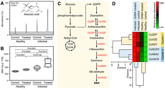 Effect of γ-aminobutyric acid (GABA) supplementation on the endogenous abscisic acid (ABA) levels and its biosynthesis genes in the leaves of healthy and ‘Ca. L. asiaticus’-infected Valencia sweet orange (C. sinensis). (A) Representative chromatograms of ABA from healthy and Ca. L. asiaticus’-infected (infected) leaves without GABA treatment (Control) or after the treatment with 10 mM GABA (treated). (B) Endogenous ABA contents (ng g−1 FW) from healthy and Ca. L. asiaticus’-infected (infected) leaves without GABA treatment (Control) or after the treatment with 10 mM GABA (treated). The minimum and the maximum values are presented by whiskers, while thick horizontal lines specify the median. Boxes show the interquartile ranges (25th to 75th percentile of the data), white dots represent the raw data (n = 6), and the gray shading represents the corresponding violin plot. Presented p-values are based on a two-tailed t-test to statistically compare each pair of treatments. Statistical significance was established as p < 0.05. (C) Schematic representation of the ABA biosynthesis pathway. (D) Relative gene expression of ABA biosynthesis genes in healthy and Ca. L. asiaticus’-infected (infected) leaves without GABA treatment (Control) or after the treatment with 10 mM GABA (GABA treated). The transcript levels were organized using two-way hierarchical cluster analysis (HCA) using standardized gene expression patterns using Ward’s minimum variance method and presented as a heat map. Rows represent different genes, while columns represent different treatments. Low and high expression levels are indicated with green and red colors, respectively (see the scale at the top right corner). The full list of expressed genes, names, accession numbers, and primers is available in Supplemental Table S3.