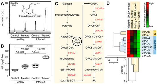 Effect of γ-aminobutyric acid (GABA) supplementation on the endogenous trans-jasmonic acid (tJA) levels and its biosynthesis genes in the leaves of healthy and ‘Ca. L. asiaticus’-infected Valencia sweet orange (C. sinensis). (A) Representative chromatograms of tJA from healthy and Ca. L. asiaticus’-infected (infected) leaves without GABA treatment (Control) or after the treatment with 10 mM GABA (treated). (B) Endogenous tJA contents (ng g−1 FW) from healthy and Ca. L. asiaticus’-infected (infected) leaves without GABA treatment (Control) or after the treatment with 10 mM GABA (treated). The minimum and the maximum values are presented by whiskers, while thick horizontal lines specify the median. Boxes show the interquartile ranges (25th to 75th percentile of the data), white dots represent the raw data (n = 6), and the gray shading represents the corresponding violin plot. Presented p-values are based on a two-tailed t-test to statistically compare each pair of treatments. Statistical significance was established as p < 0.05. (C) Schematic representation of the tJA biosynthesis pathway. (D) Relative gene expression of tJA biosynthesis genes in healthy and Ca. L. asiaticus’-infected (infected) leaves without GABA treatment (Control) or after the treatment with 10 mM GABA (GABA treated). The transcript levels were organized using two-way hierarchical cluster analysis (HCA) using standardized gene expression patterns using Ward’s minimum variance method and presented as a heat map. Rows represent different genes, while columns represent different treatments. Low and high expression levels are indicated with green and red colors, respectively (see the scale at the top right corner). The full list of expressed genes, names, accession numbers, and primers is available in Supplemental Table S4.
