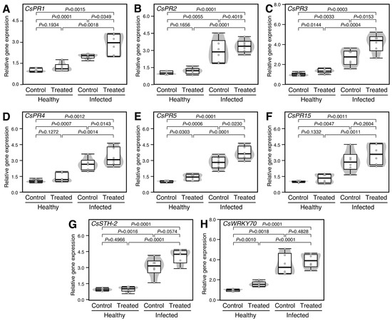 Effect of γ-aminobutyric acid (GABA) supplementation on the relative gene expression of pathogenesis-related proteins (PRs) in the leaves of healthy and ‘Ca. L. asiaticus’-infected Valencia sweet orange (C. sinensis). (A–F) Relative gene expression of six PRs included CsPR1, CsPR2, CsPR3, CsPR4, CsPR5, and CsPR15, respectively. (G) Relative gene expression of pathogenesis-related protein STH-2-like (CsSTH-2) and (H) Relative gene expression of WRKY70 transcription factor (CsWRKY70), an activator of SA-dependent defense. The minimum and the maximum values are presented by whiskers, while horizontal thick lines specify the median. Boxes show the interquartile ranges (25th to 75th percentile of the data), white dots represent the raw data (n = 6), and gray shading represents the corresponding violin plot. Presented p-values are based on a two-tailed t-test to statistically compare each pair of treatments. Statistical significance was established as p < 0.05. The full list of expressed genes, names, accession numbers, and primers is available in Supplemental Table S5.