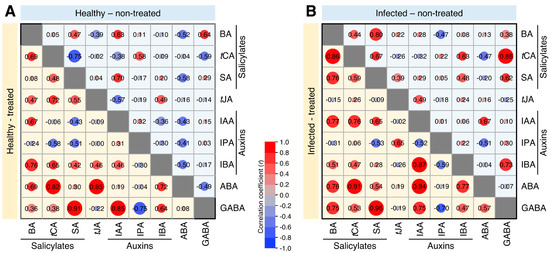 Correlation matrix among different phytohormone groups and endogenous GABA detected in Valencia sweet orange (C. sinensis) leaves without GABA treatment (Control) or after the treatment with 10 mM GABA (treated). (A) healthy leaves and (B) Ca. L. asiaticus’-infected leaves. Correlation coefficients (r) based on Pearson product-moment correlation are indicated by the color intensity and circle size. The color scale, in the middle of the graph, illustrates the correlation coefficients and their corresponding colors. BA: benzoic acid, tCA: trans-cinnamic acid, SA: salicylic acid, tJA: trans-jasmonic acid, IAA: indole-3-acetic acid, IPA: indole-3-propionic acid, IBA: indole-3-butyric acid, ABA: abscisic acid, and GABA: γ-aminobutyric acid.