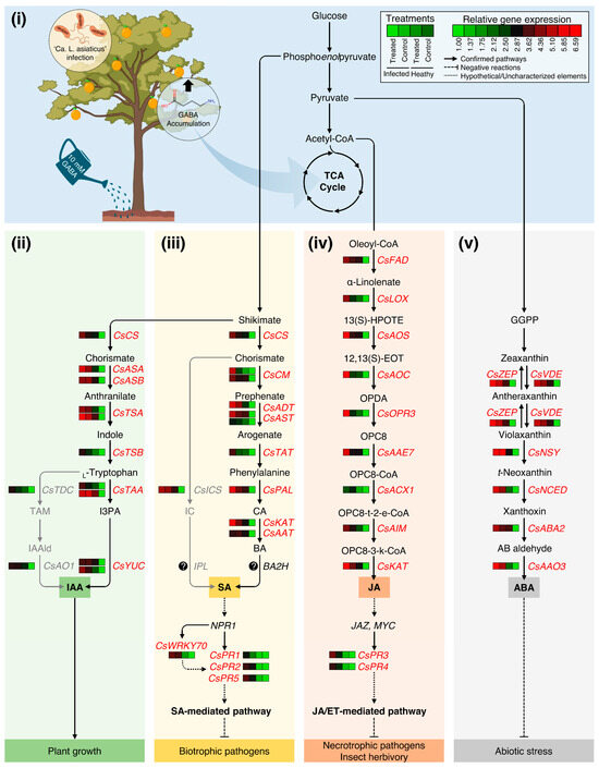 Hypothetical model for the potential effects of GABA supplementation on different phytohormonal pathways in Valencia sweet orange (C. sinensis) and their roles in citrus defense responses. In this model, we proposed that exogenous GABA application via root drench might enhance citrus response to the infection with the bacterial pathogen ‘Ca. L. asiaticus’ via modulation of different phytohormone groups, particularly stress-associated phytohormones. Briefly, (i) exogenous GABA application boosts the accumulation of endogenous GABA in the leaves of both healthy and ‘Ca. L. asiaticus’-infected plants. GABA accumulation in the leaves benefits the activation of a phytohormones-based multi-layered defensive system via promoting the endogenous content of auxins, SA, JA, ABA, and their biosynthetic genes. (ii) GABA accumulation stimulates the auxin biosynthesis in GABA-treated ‘Ca. L. asiaticus’-infected plants via the activation of the indole-3-pyruvate (I3PA) pathway, not via the tryptamine (TAM)-dependent pathway. Higher auxin levels are involved in enhancing the growth of HLB-affected tress via several biochemical and physiological modifications, yet to be identified. (iii) GABA accumulation is also associated with the upregulation of SA biosynthesis genes, particularly the PAL-dependent route, resulting in higher SA levels that activate NPR1 and subsequently CsPR1, CsPR2, CsPR5, and CsWRKY70 prominent to activation of SA-mediated pathway against biotrophic phytopathogens. (iv) GABA supplementation induces JA biosynthesis. Enhanced JA levels are linked with both CsPR3 and CsPR4 which activate the JA-mediated pathway against insect herbivory and necrotrophic phytopathogens. Finally, (v) GABA application enhances the ABA biosynthesis pathway to protect citrus plants against abiotic stress. Solid lines with arrows indicate the well-established/confirmed pathways and the dashed lines with whiskers signify negative reactions, whereas round-dotted lines represent hypothetical mechanisms or uncharacterized elements. Relative gene expressions of phytohormones biosynthesis-related genes and pathogenesis-related proteins (PRs) are presented as a heatmap using the non-standardized gene expression patterns using Ward’s minimum variance method. Low and high expression levels are indicated with green and red colors, respectively (see the scale at the top right corner). The full list of expressed genes, names, accession numbers, and primers is available in Supplemental Materials (Tables S1–S5).