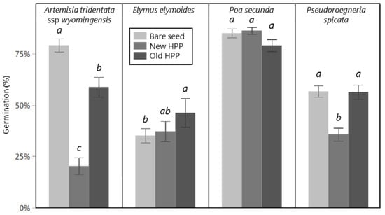 Percent germination in petri dish trial of bare seed (light gray), newly made HPPs (medium gray), and older HPPs (dark gray) separated by species (across the top). Note that the seed used in the bare seed and new HPP treatments was stored as bare seed until the new HPPs were made immediately prior to the germination trial, whereas seed in old HPPs was stored as fully prepared HPPs. Storage conditions for all HPPs and bare seed of all species were in non-airtight paper bags or plastic grain bags at 10–20 °C, 25–35% RH, except A. tridentata bare seed (which includes the seed made into new HPPs), which was stored in air-tight plastic bags at 1–4 °C, 20–30% RH. Within each panel (species), means are significantly different from one another at the p < 0.05 level, unless displaying the same letter, based on Tukey HSD tests. For each bar, errors are one standard error, and n = 16 (A. tridentata, P. spicata) or n = 24 (E. elymoides, P. secunda).