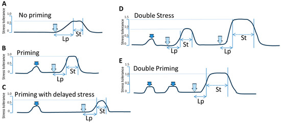 Schematic presentation of stress tolerance with and without priming. A light blue long arrow pointing down indicates the stress exposure. Short dark blue arrow shows priming. “Lp”—latent period (shown as solid double-ended arrow), time required to mount stress tolerance; “St”—stress tolerance (shown as dashed double-ended arrow). Y axis shows arbitrary scale (from 0 to 1.5) indicating the level of stress tolerance. (A) “No priming” is characterized by long Lp and relatively low (at arbitrary level of ~0.7) and short-lasting St. (B) “Priming” is characterized by shorter Lp and higher (at arbitrary level of ~1.0) and longer lasting St. (C) “Priming with delayed stress”—likely similar in effect to “No priming” or somewhere between “Priming” and “No priming”. (D) “Double stress”—first stress response after priming is characterized by shorter Lp and stronger, longer St, similar to “Priming”, but the second stress exposure results in even stronger (arbitrary level of ~1.5) and longer lasting St. (E) “Double Priming” is characterized by shorter Lp and stronger (arbitrary level of ~1.2) and longer lasting St, which is somewhere between “Priming” and “Double stress”.