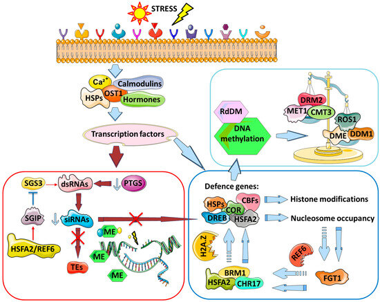 Potential mechanisms of the response to stress and activation of stress memory. Stress is perceived at many levels, including changes in Ca2+ in the cell, the activation of calmoldulins, changes in protein folding, hormonal levels, and many more. This results in the activation of various stress-specific transcription factors that on one side activate stress-responsive genes, and on another side, release the RdDM regulation of transposons and various stress-responsive genes. The activation of HSPs/COR/CBFs/DREB and other proteins results in changes in histone modifications and nucleosome occupancy, which, in turn, activates proteins like FGT1 and REF6 that activate proteins like BMR1, CHR17, and HSFA2 that are able to maintain pockets of permissive chromatin and low nucleosome occupancy, leading to stress memory. A decrease in methylation at transposons results in an increase in the production of dsRNAs that would typically be processed to siRNAs. Heat stress activates HSFA2 that results in the inhibition of the SGS3 protein involved in siRNA production, resulting in a decrease in the number of produced siRNAs and, thus, a decrease in methylation and the suppression of transposons and stress-responsive loci (indicated by crossed red arrows), allowing the stress memory to persist. Finally, transcription factors activate RdDM and DNA methylation machinery that establish a differential pattern of DNA methylation/gene expression at stress-responsive loci. The maintenance of the memory of stress would depend on the equilibrium of DNA methyltransferases, enzymes removing methylation marks such as ROS1 and DEMETER (DME) [46], and chromatin modifiers like DDM1.