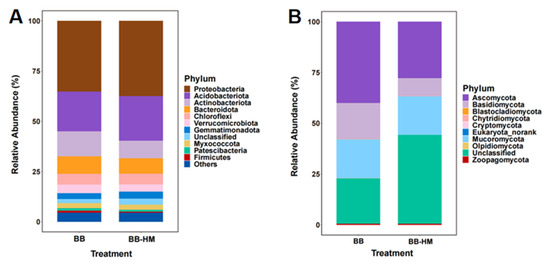 Relative abundance of bacteria (A) and fungi (B) at the phylum level. BB-HM denotes bayberry and ryegrass co-cultivation; BB indicates bayberry without a cover crop.