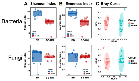 Taxonomic α- and β-diversity estimates from the rhizosphere soil of bayberry trees. (A) Shannon indexes of bacteria and fungi; (B) evenness indexes of bacteria and fungi; (C) PCoA results of soil bacteria and fungi based on OTU abundance. BB-HM denotes bayberry and ryegrass co-cultivation; BB indicates bayberry without a cover crop.