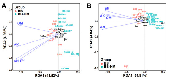 Redundancy discriminant analysis discriminant analysis (RDA) of the rhizosphere bacterial (A) and fungal (B) community composition at genus level with soil physicochemical properties. Sub: Subgroup 2_norank; Bur: Burkholderia-Caballeronia-Paraburkholderia; Aci: Acidobacteriales_norank; Bra: Bradyrhizobium; Vib: Vibrionimonas; Els: Elsterales_norank; Unc: Unclassified; Gem: Gemmatimonadaceae_uncultured; KF: KF-JG30-C25_norank; Can: Candidatus Solibacter; Mor: Mortierella; Trc: Trichocladium; Tre: Trechispora; Trd: Trichoderma; Pen: Penicillium; Fus: Fusarium; Pod: Podospora; Ple: Plectosphaerella; Cys: Cystolepiota; OM: organic matter; AN: available nitrogen; AP: available phosphorus; AK: available kalium; EA: exchangeable aluminum. BB-HM denotes bayberry and ryegrass co-cultivation; BB indicates bayberry without a cover crop.